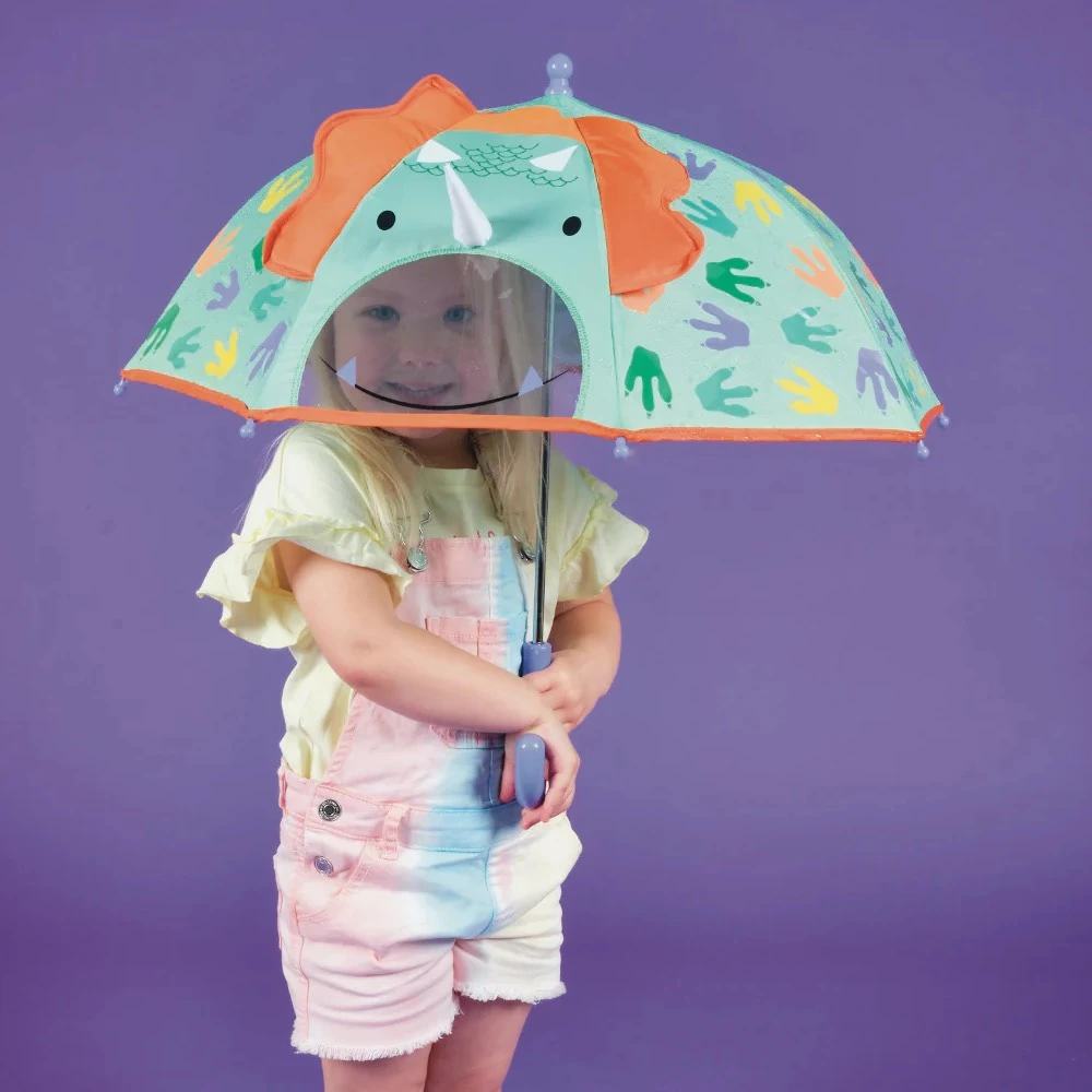 Η Floss & Rock Παιδική Ομπρέλα Δεινόσαυρος αλλάζει χρώμα στη βροχή, με διάφανο παράθυρο και 3D στοιχεία.