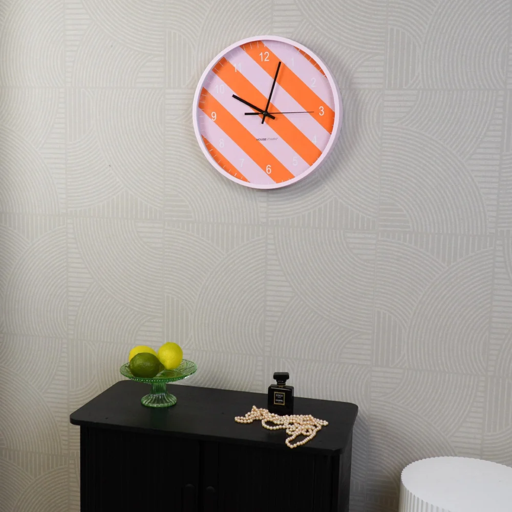 Μοντέρνο ρολόι τοίχου HOUSEVITAMIN Striped Pattern σε orange/pink, με ζωηρό design και καθαρό καντράν.
