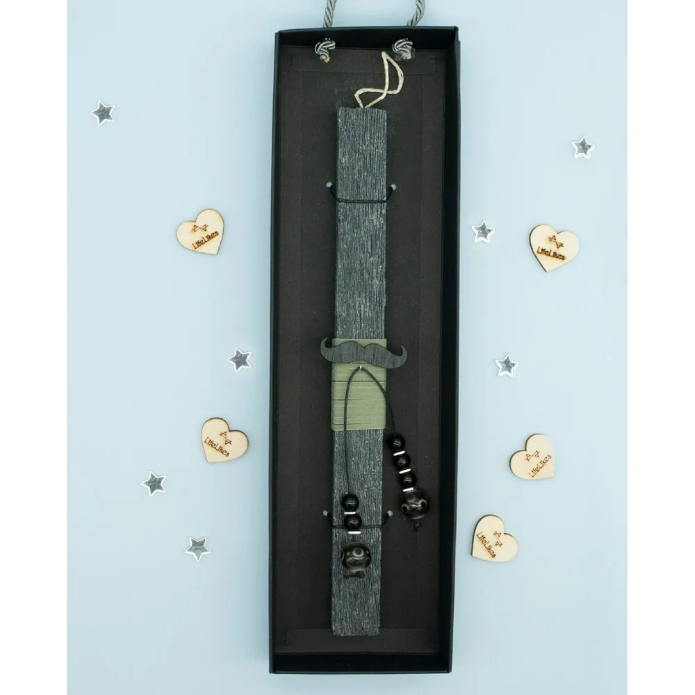 Χειροποίητη λαμπάδα με μπεγλέρι από μαύρες πέτρες, σε κομψό συρταρωτό κουτί.