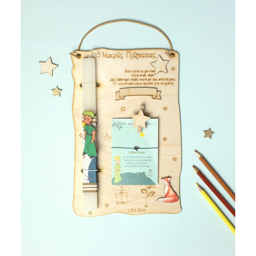 Χειροποίητη λαμπάδα με αρωματικό κερί, βραχιολάκι με αιματίτη σε σχήμα αστεριού και ξύλινο κάδρο που μετατρέπεται σε προσωποποιημένη κορνίζα – εμπνευσμένο από τον Μικρό Πρίγκιπα και το σύμπαν των αστεριών.