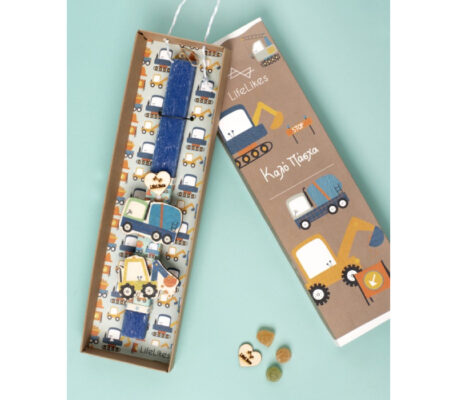 Χειροποίητη λαμπάδα με ξύλινα μαγνητάκια-καρχαριάκια σε συρταρωτό κουτί.