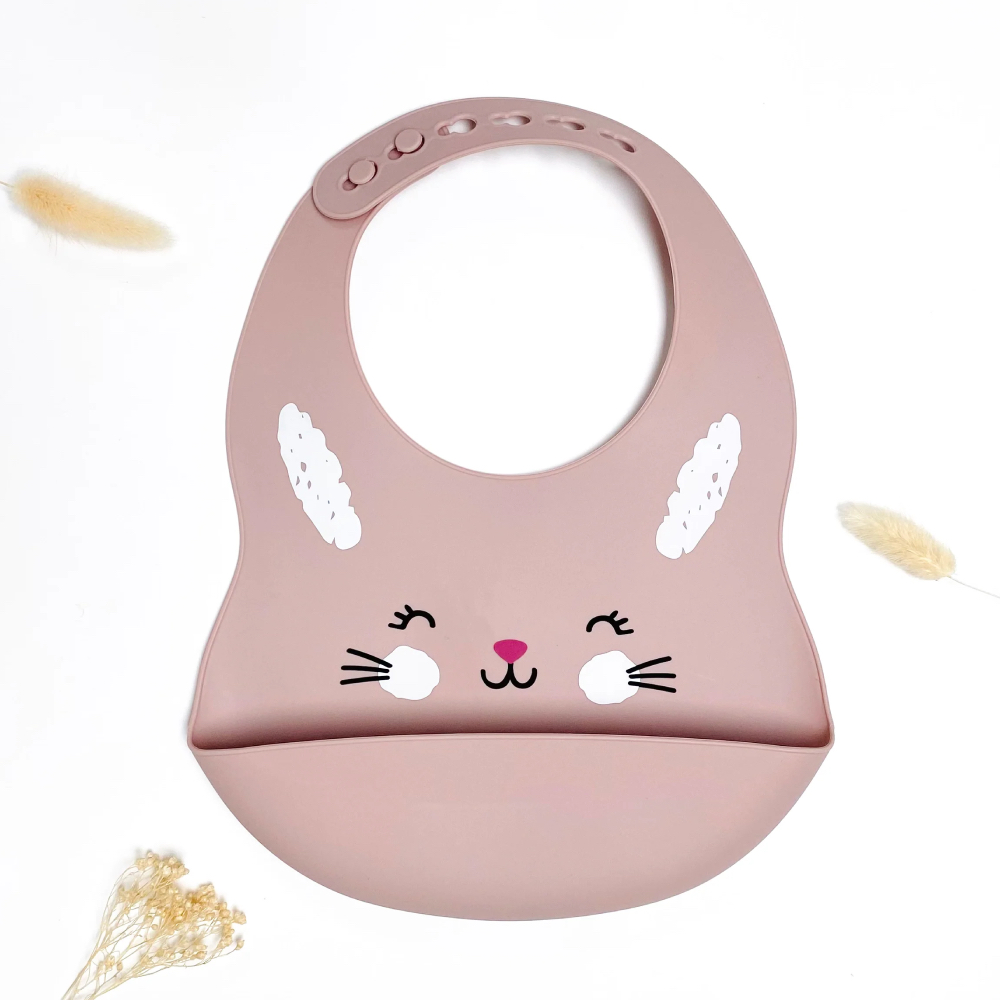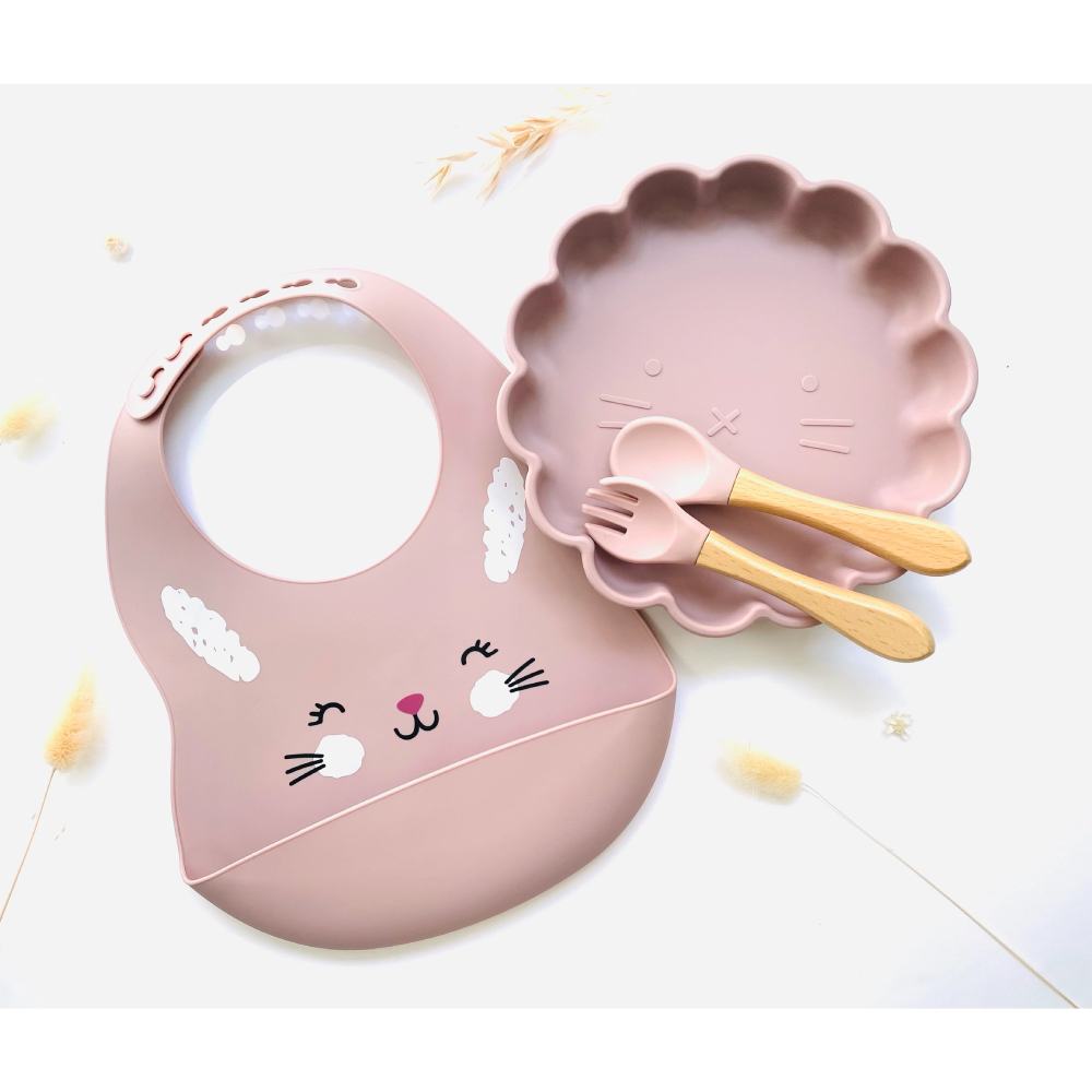 Ροζ σετ γεύματος Bunny με πιάτο σιλικόνης, μαχαιροπίρουνα μπαμπού και σαλιάρα.