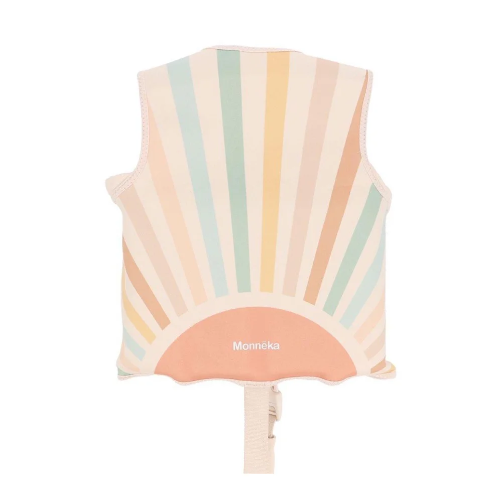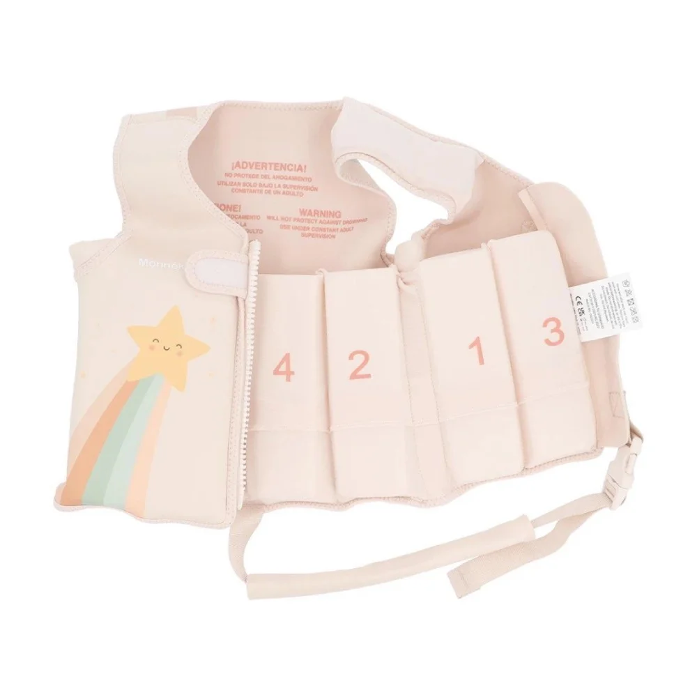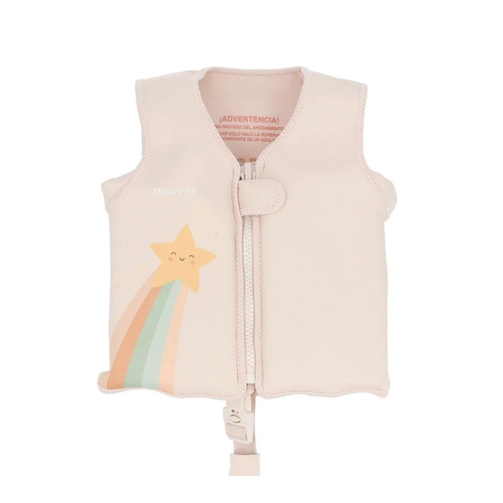 Παιδικό γιλέκο κολύμβησης Monneka σε ροζ με αστέρια, με ρυθμιζόμενα κομμάτια επίπλευσης, ιδανικό για ασφαλές παιχνίδι στη θάλασσα ή την πισίνα.