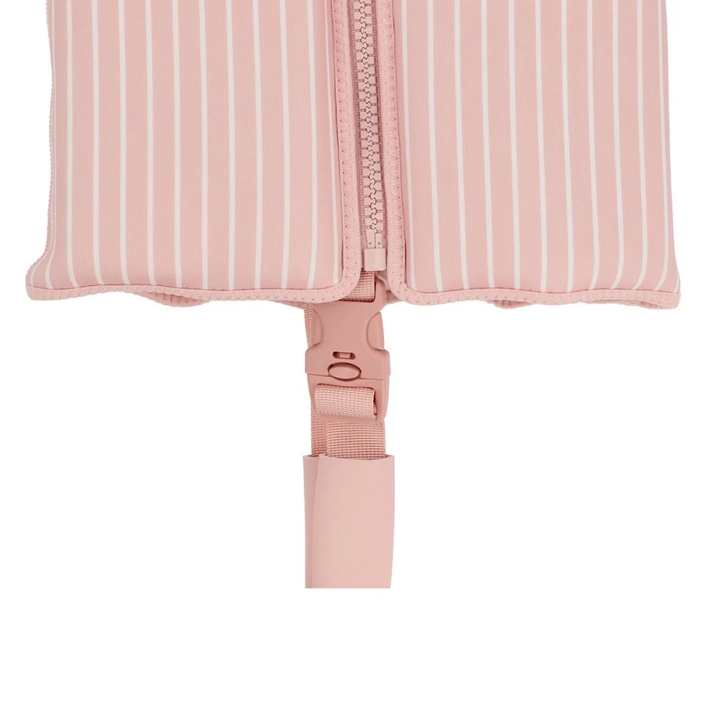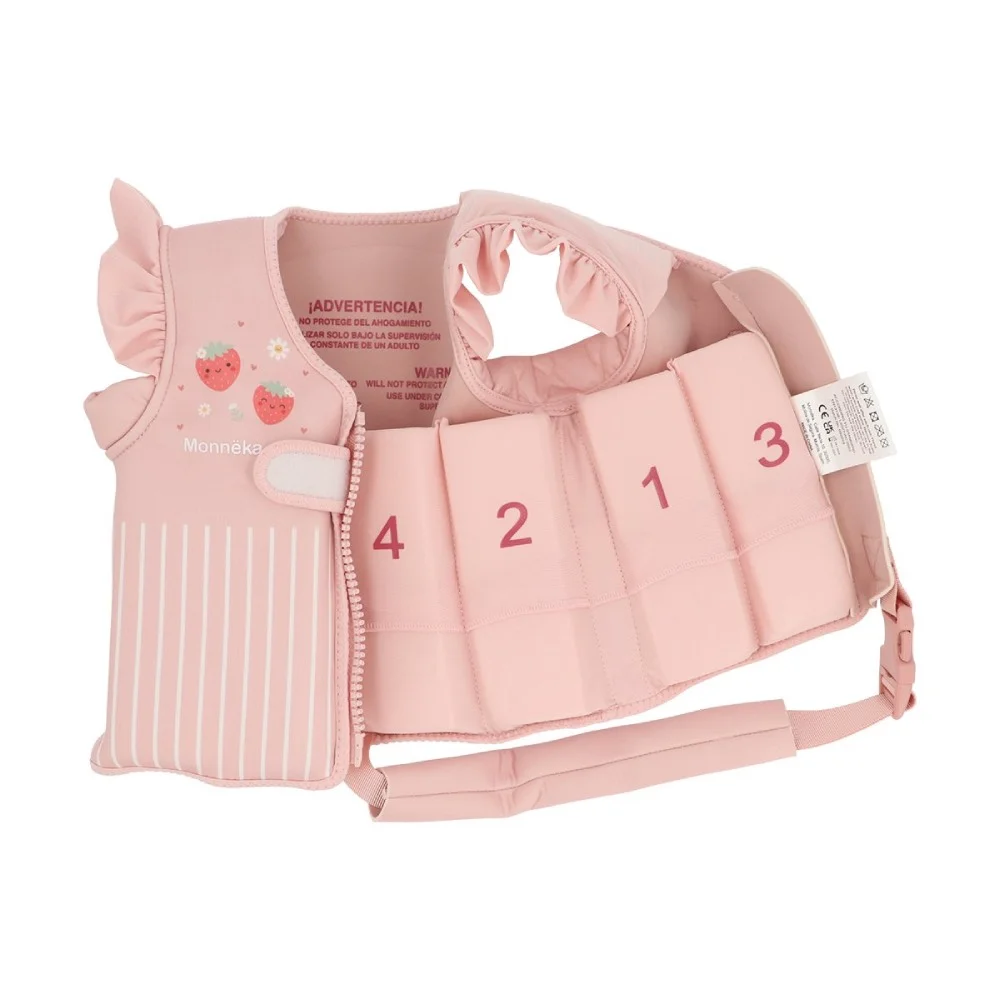 Discover the lovely Monneka Strawberries Collection Floating Vest for kids aged 1-2 years. This adorable pink vest with strawberry print features a safety strap with a buckle that goes between the legs to prevent slipping over the head, especially when jumping into the water. The strap is covered with soft neoprene to avoid chafing. The vest now has improved buoyancy thanks to a high-buoyancy PVC foam pocket on the upper front. It includes 8 compartments, each with 3 buoyancy elements, making a total of 24 pieces that can be gradually removed to help children learn to swim safely. Extra underarm protection prevents chafing, and it comes with an extra-strong zipper for durability. Designed in collaboration with swimming experts and certified EN13138-1:2021/AC:2022. Delivered in a reusable mesh bag. Note: This is a swimming aid, not a life jacket. Supervision is required.