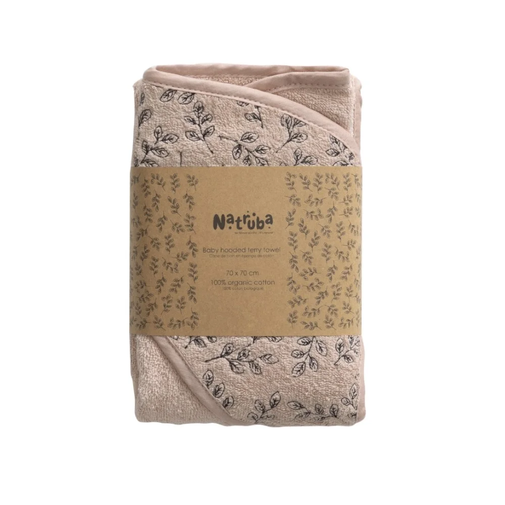 Βρεφική πετσέτα μπάνιου σε ροζ απόχρωση από οργανικό βαμβάκι terry της Natruba, με κουκούλα και κέντημα φύλλου.