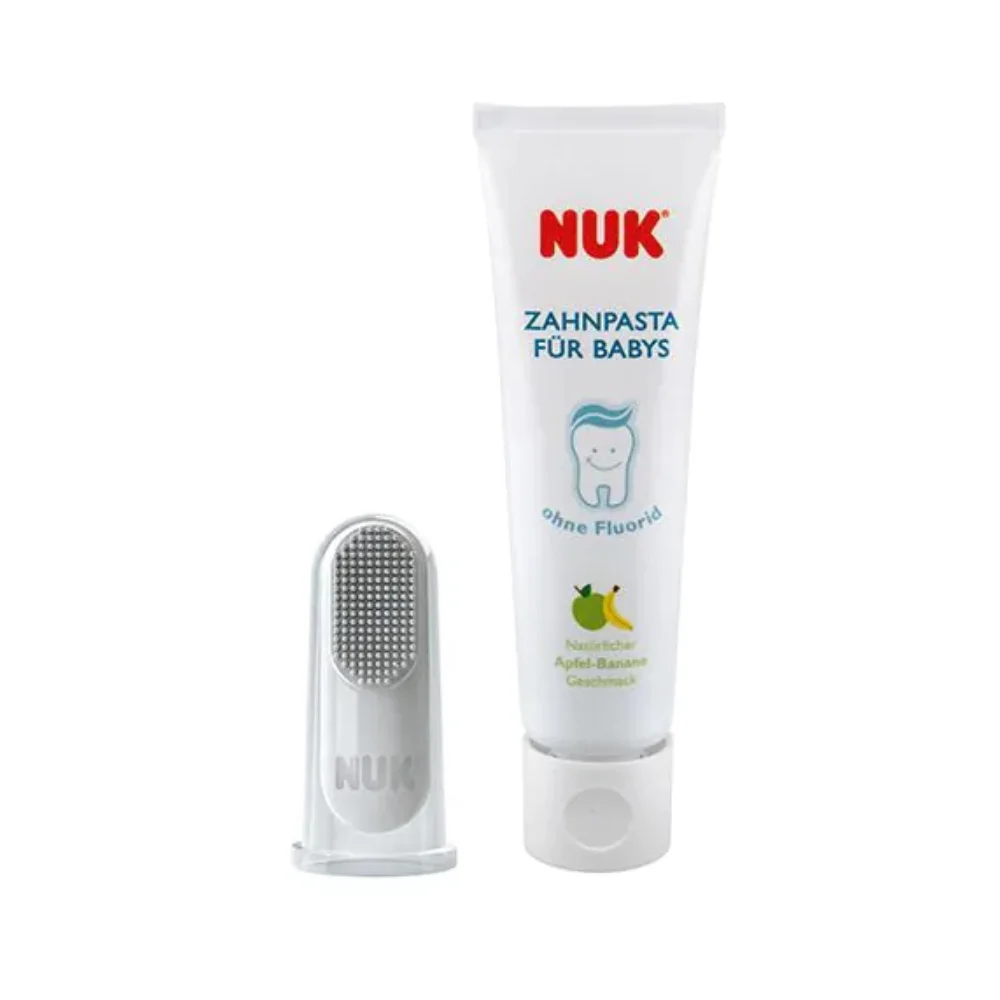 NUK Σετ Στοματικής Υγιεινής Οδοντόκρεμα & Δακτυλική Οδοντόβουρτσα Γεύση Μήλο – Μπανάνα 3+ μηνών