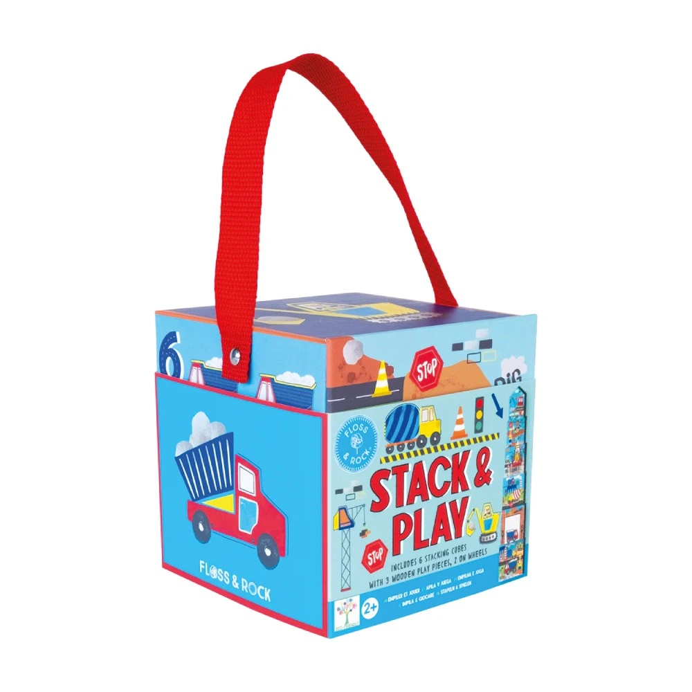 Το Floss & Rock Παιχνίδι Στοίβαξης Construction περιλαμβάνει 6 κύβους και 3 ξύλινα οχήματα, με σχέδια από κατασκευαστικά οχήματα.