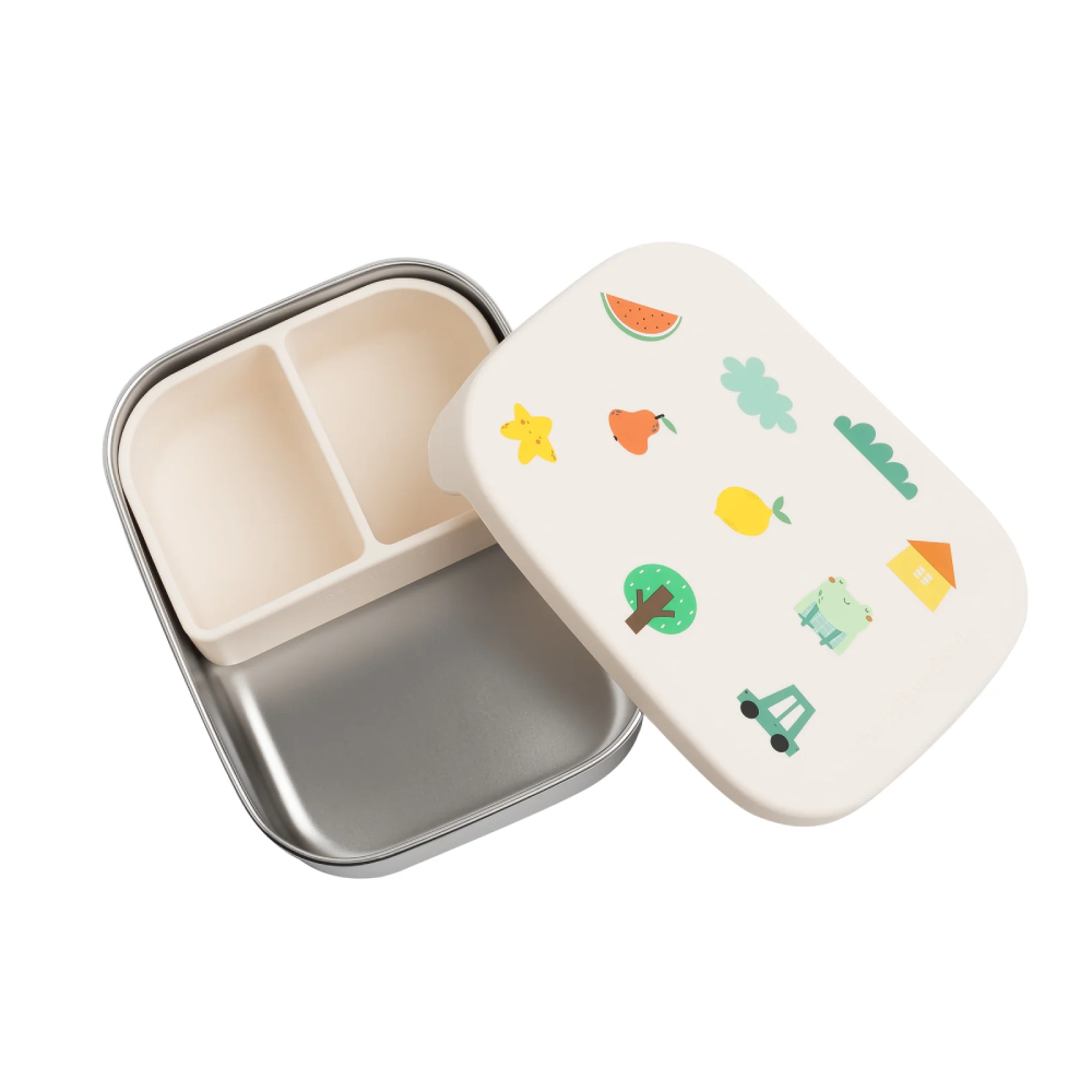 Ανθεκτικό φαγητοδοχείο από ανοξείδωτο ατσάλι και LFGB-πιστοποιημένη σιλικόνη, με αποσπώμενα διαμερίσματα για ξεχωριστή αποθήκευση τροφίμων.