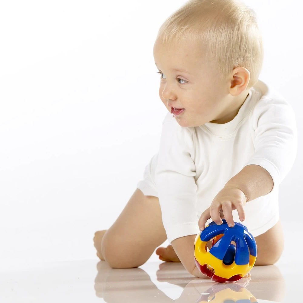 Βρεφική κουδουνίστρα μπαλίτσα με έντονα χρώματα για οπτική διέγερση & απαλό ήχο για ακουστική ανάπτυξη.