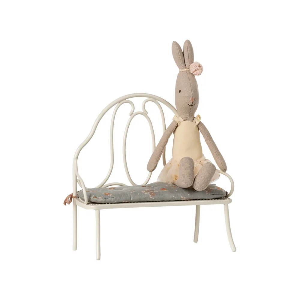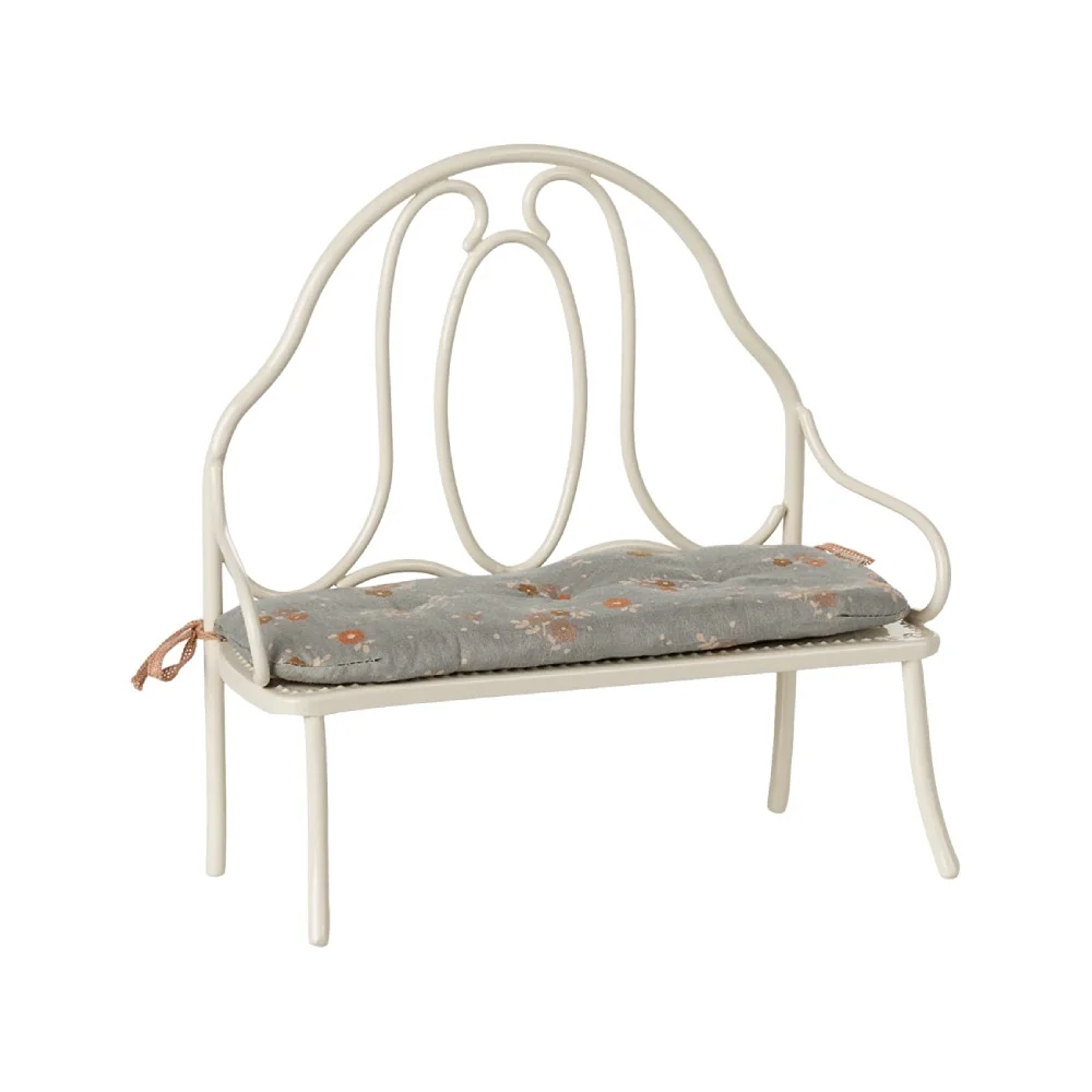 Vintage παγκάκι Maileg μινιατούρα σε off white απόχρωση, με μαλακό μαξιλαράκι για άνεση.